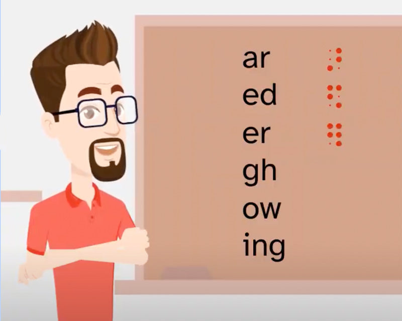Continue building fluency with more strong groupsigns including “ar,” “ed,” “er,” and “ing.” These signs are key to faster, smoother braille reading.